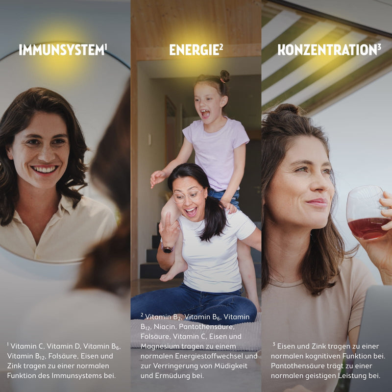With a micronutrient combination of vitamin C, D and zinc, our micronutrient complex supports your immune system¹, day after day. Magnesium, iron and vitamin B12 help to reduce fatigue and maintain your energy in everyday life². With zinc and pantothenic acid for cognitive performance and mental focus³.